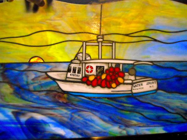 Fishing Vessel "Water Sport"This custom stained glass panel was commissioned by the wife of a Long-Liner (commercial fisherman) from Manteo NC as a birthday gift. It depicts her headed back to port.